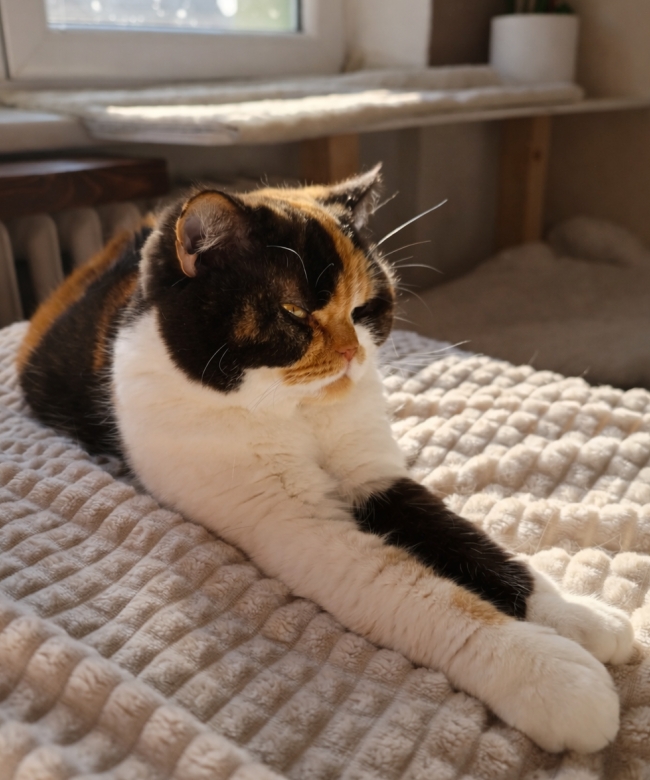 Pozdrav od Genesis mluví za vše – v novém domově si rychle vybudovala pozici kočičí paní domu, a to bez zbytečných kompromisů. Místo pro odpočinek? Kdekoliv si zrovna zamane.