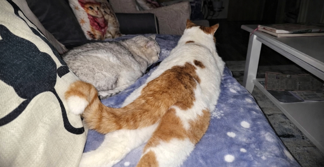 Na fotkách si oba užívají zasloužený klid, plná bříška a domácí komfort,